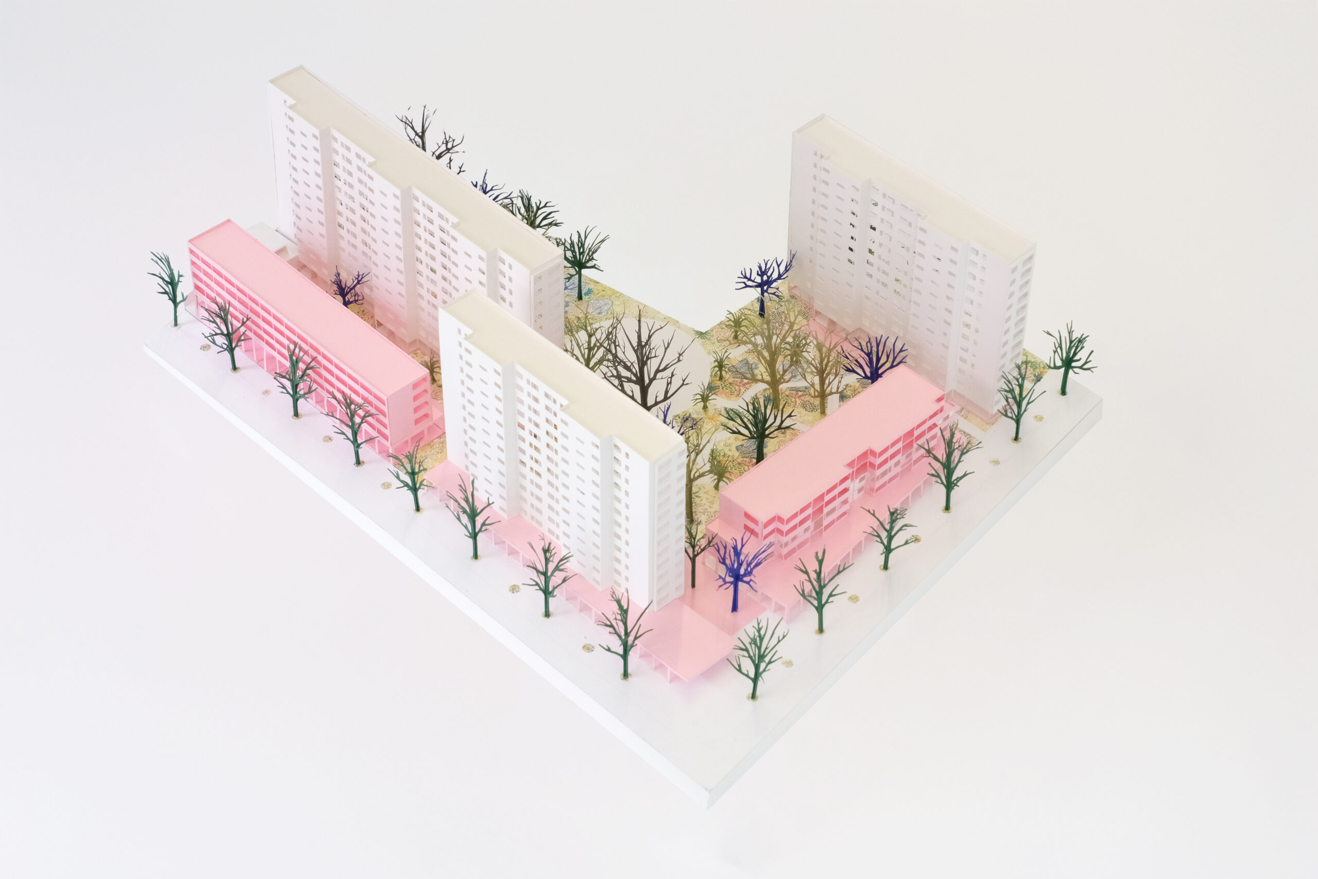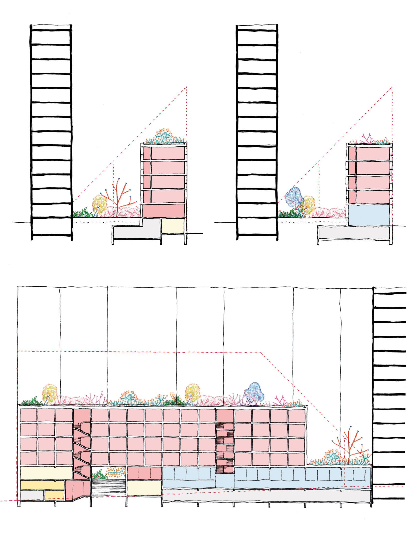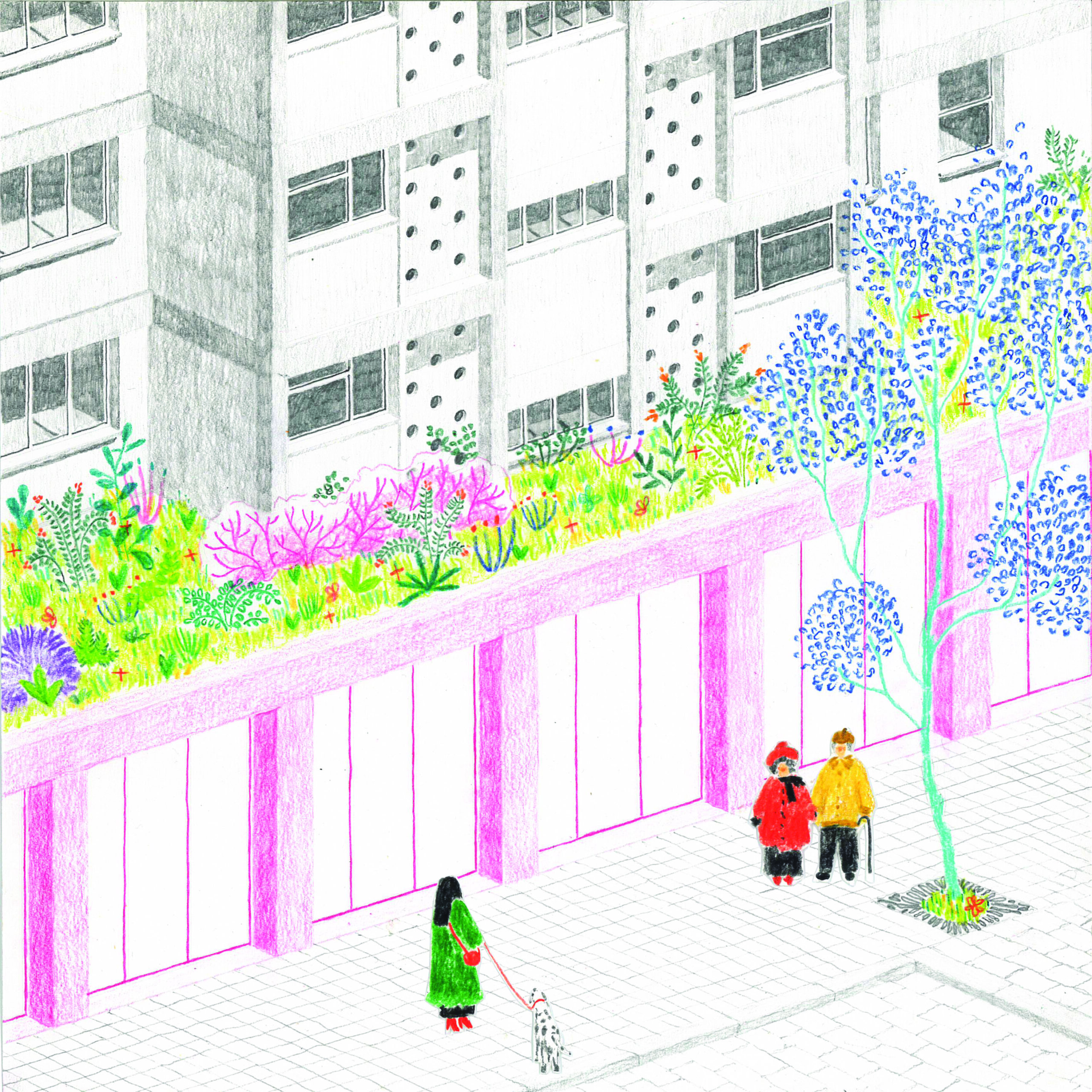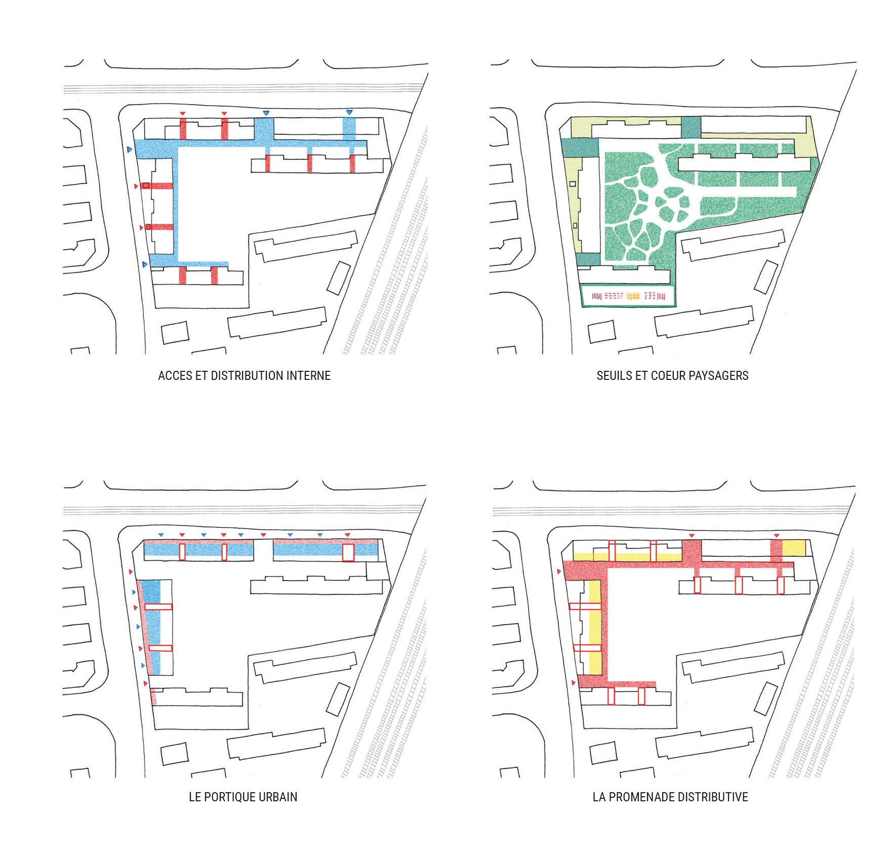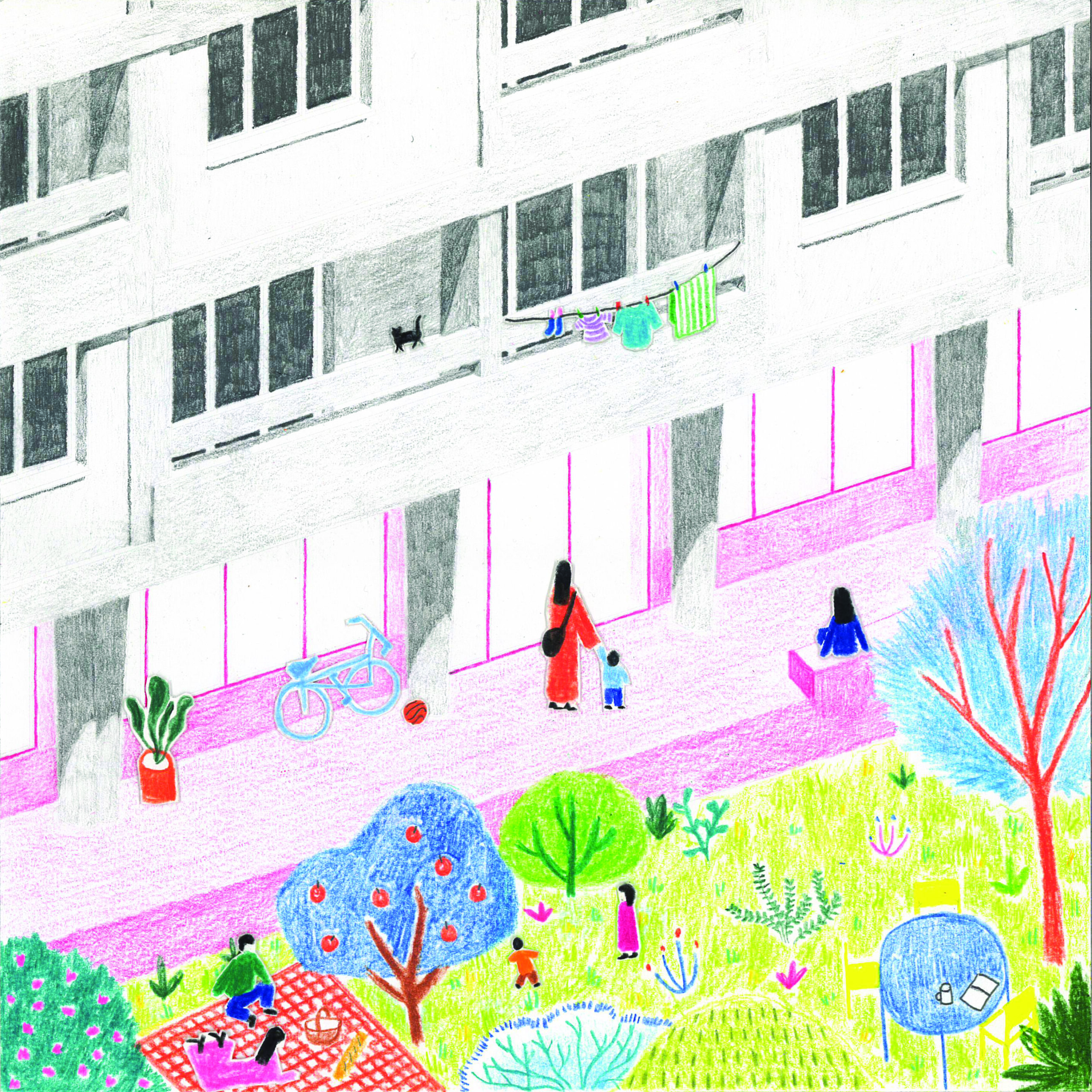 Il repose sur un renversement du rapport bâti-sol avec la suppression progressive du stationnement au profit d’un grand cœur d’îlot végétalisé, conçu comme un îlot de fraîcheur composé de clairières, de canopées arborées, de strates arbustives et de cheminements piétons doux. Une promenade distributive relie l’ensemble des halls, des locaux communs et des équipements en assurant une accessibilité PMR continue, tandis que le paysage est pensé dans une logique évolutive permettant l’effacement progressif de l’automobile. Le cœur d’îlot devient ainsi une véritable pièce de paysage centrale, support d’usages collectifs, de biodiversité et de régulation climatique.