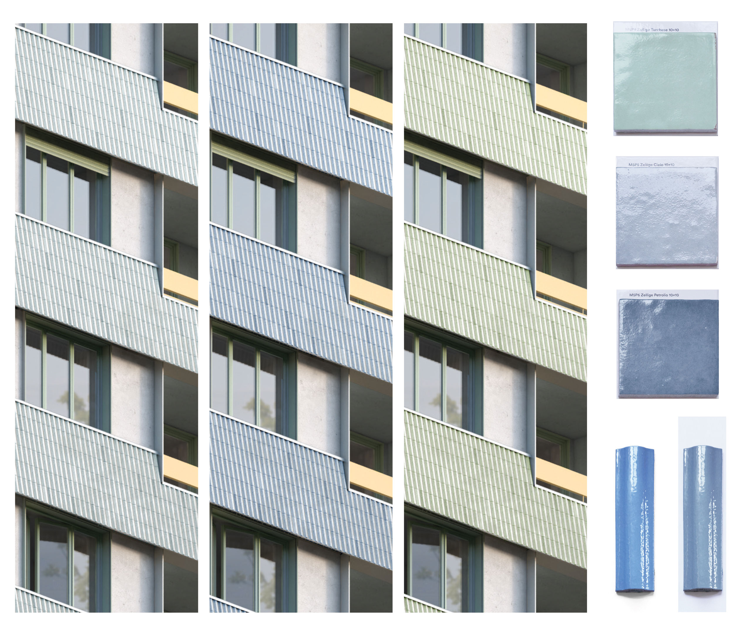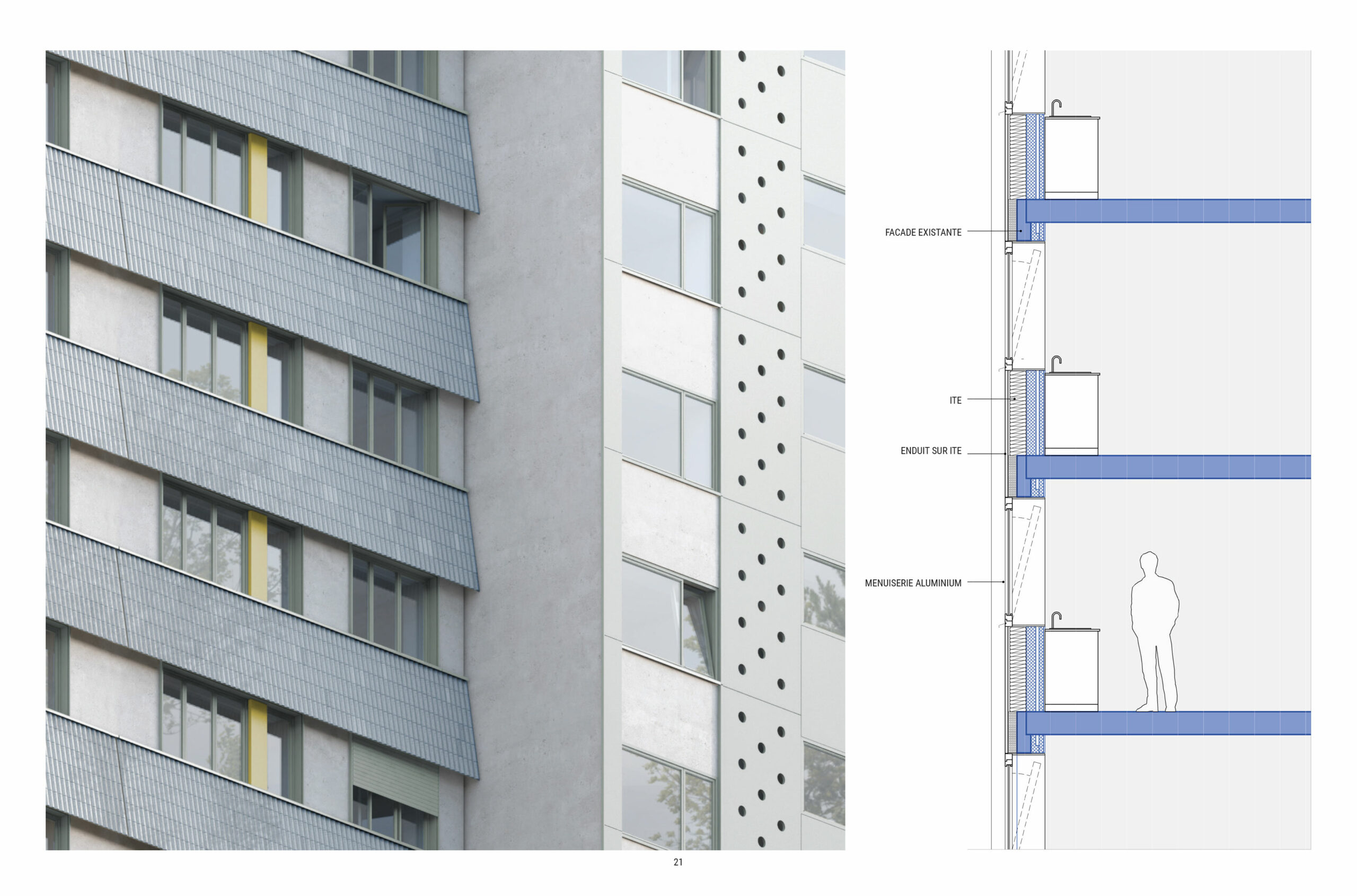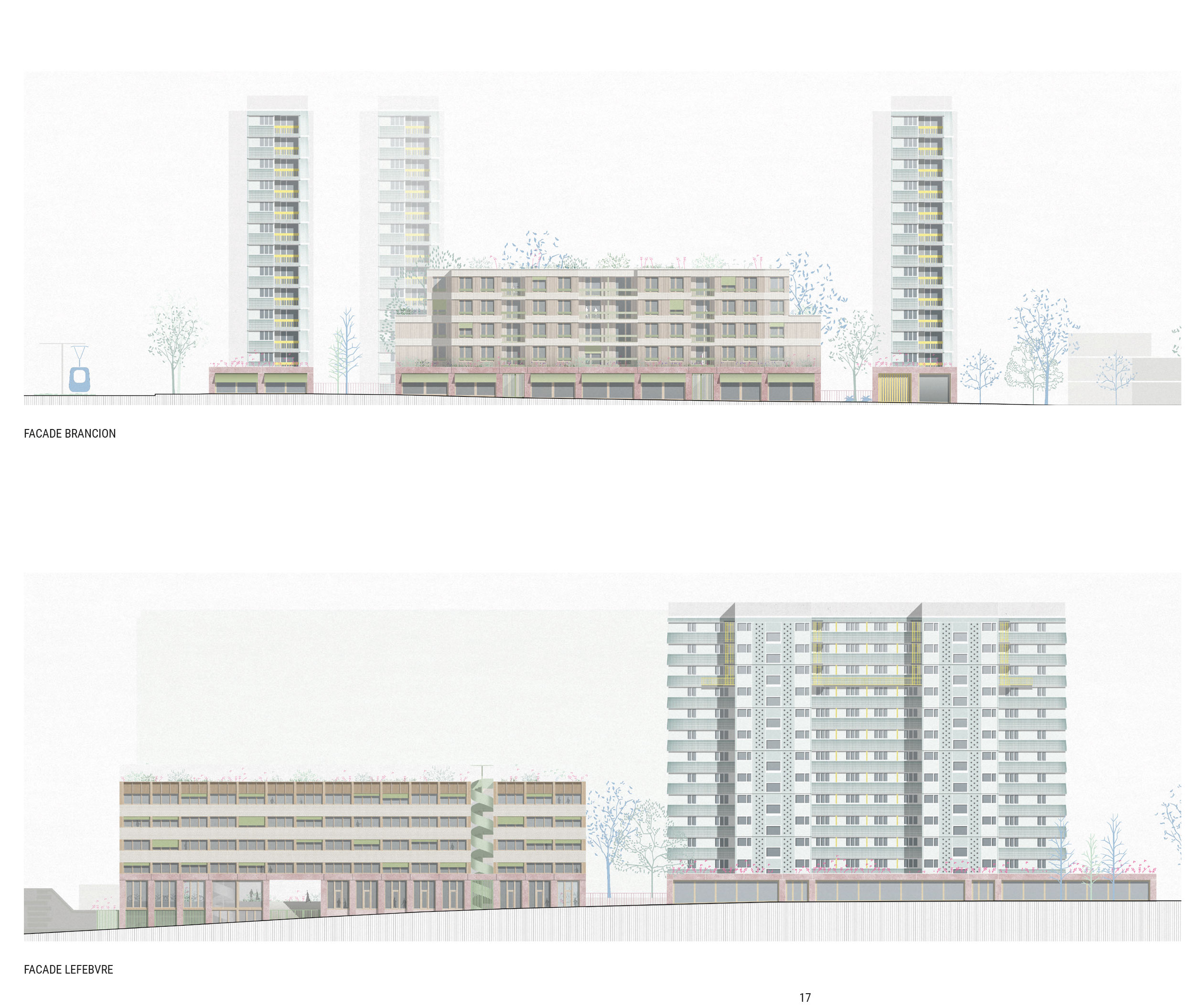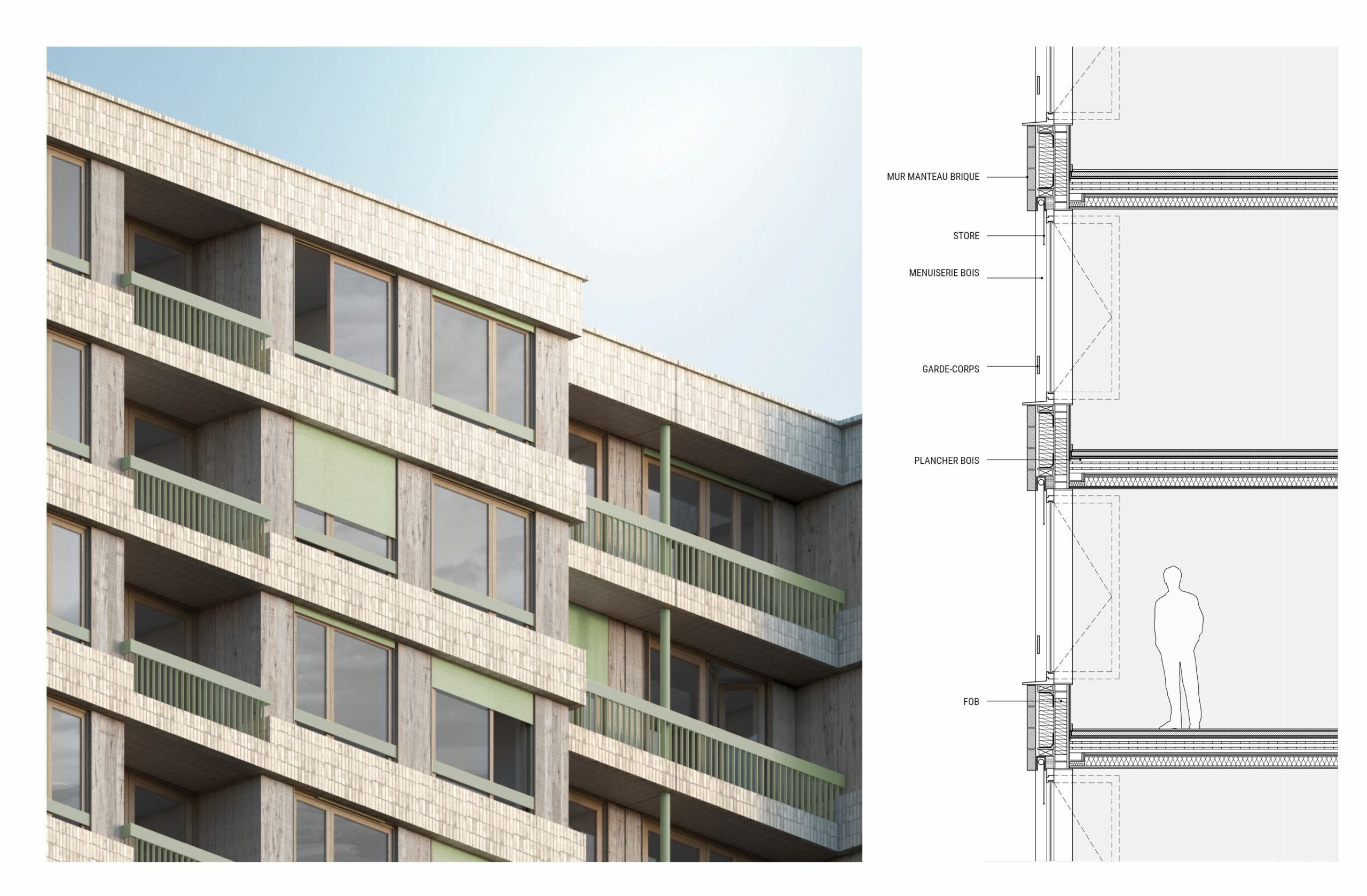 Le projet s’organise autour de trois strates architecturales cohérentes avec un socle en béton teinté et menuiseries bois largement vitré formant une base urbaine active et lisible, des bâtiments neufs en R+4 aux façades de briques et menuiseries bois composant une écriture contemporaine compacte et sobre, et enfin les bâtiments existants dont la composition d’origine est valorisée par un travail sur la profondeur, la vibration des façades et les vêtures céramiques et enduits dans une relecture du patrimoine moderne sans pastiche.