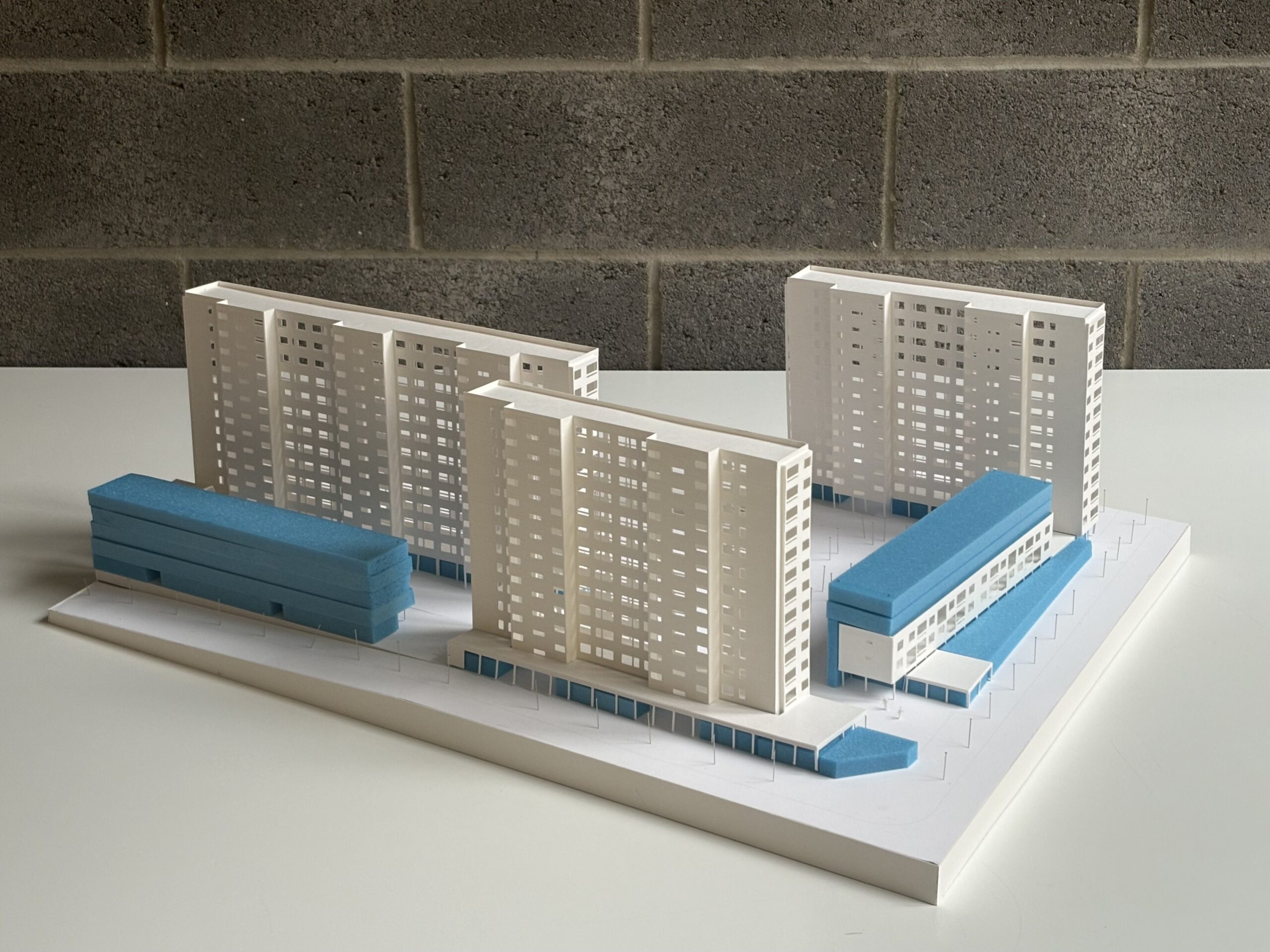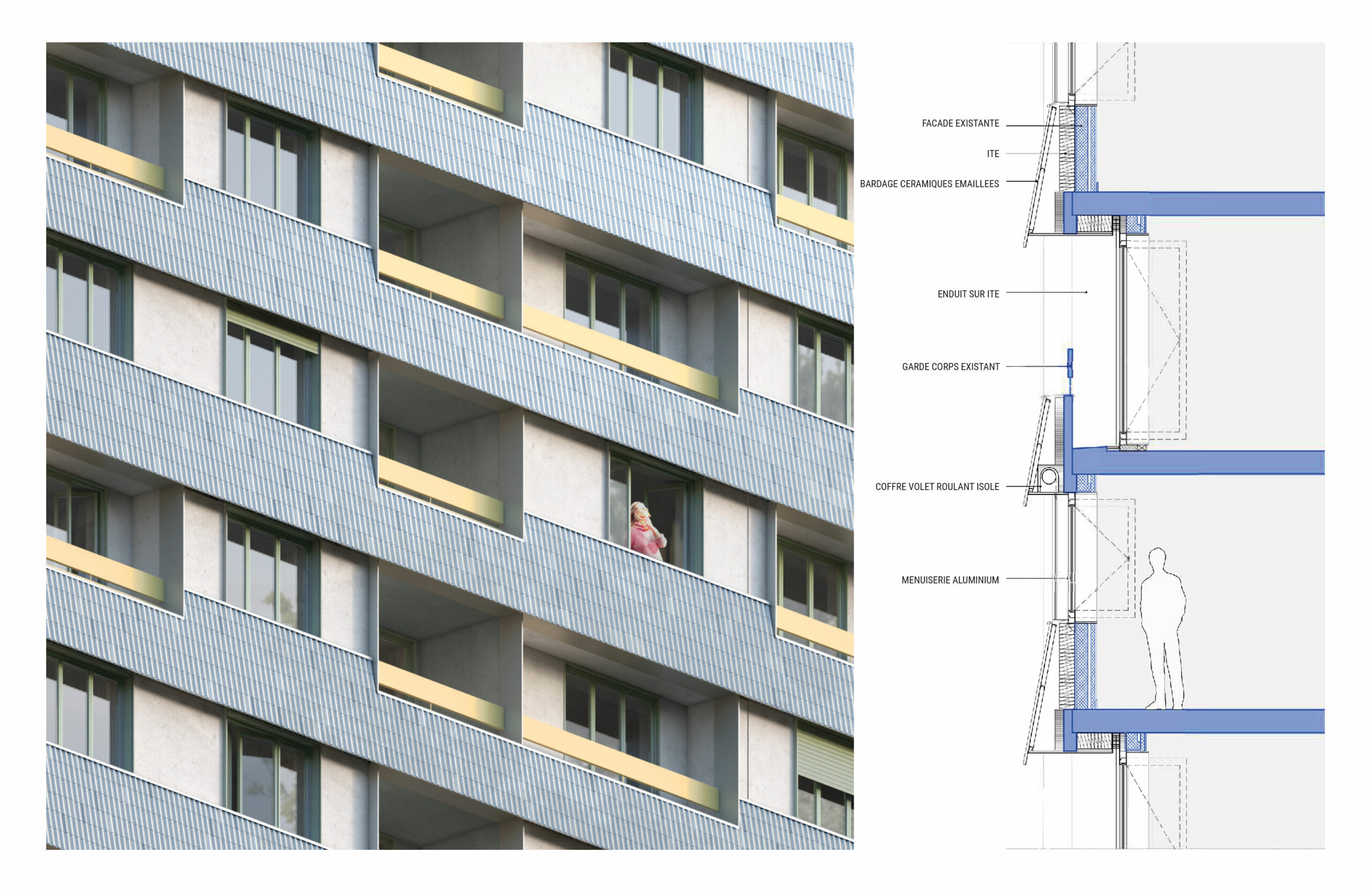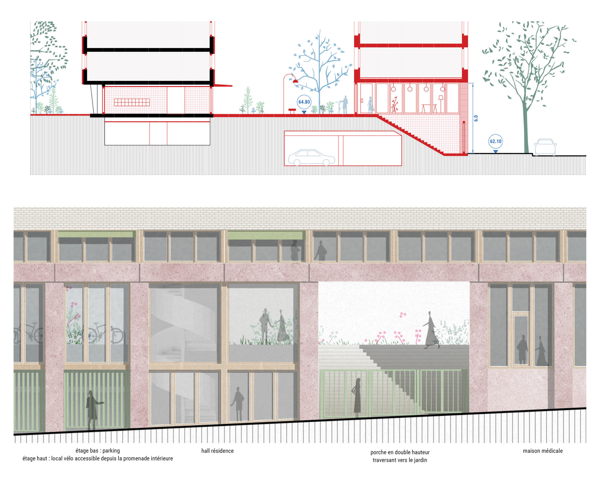 Le projet articule la réhabilitation Plan Climat des bâtiments existants en milieu occupé, avec amélioration thermique, ventilation, sécurité incendie, requalification des rez-de-chaussée et recomposition des façades et des socles – la création d’une résidence en BRS avec un socle actif de commerces, une résidence étudiante, un parking semi-enterré, une maison de santé, une salle commune en double hauteur et un porche traversant reliant le boulevard au cœur d’îlot.