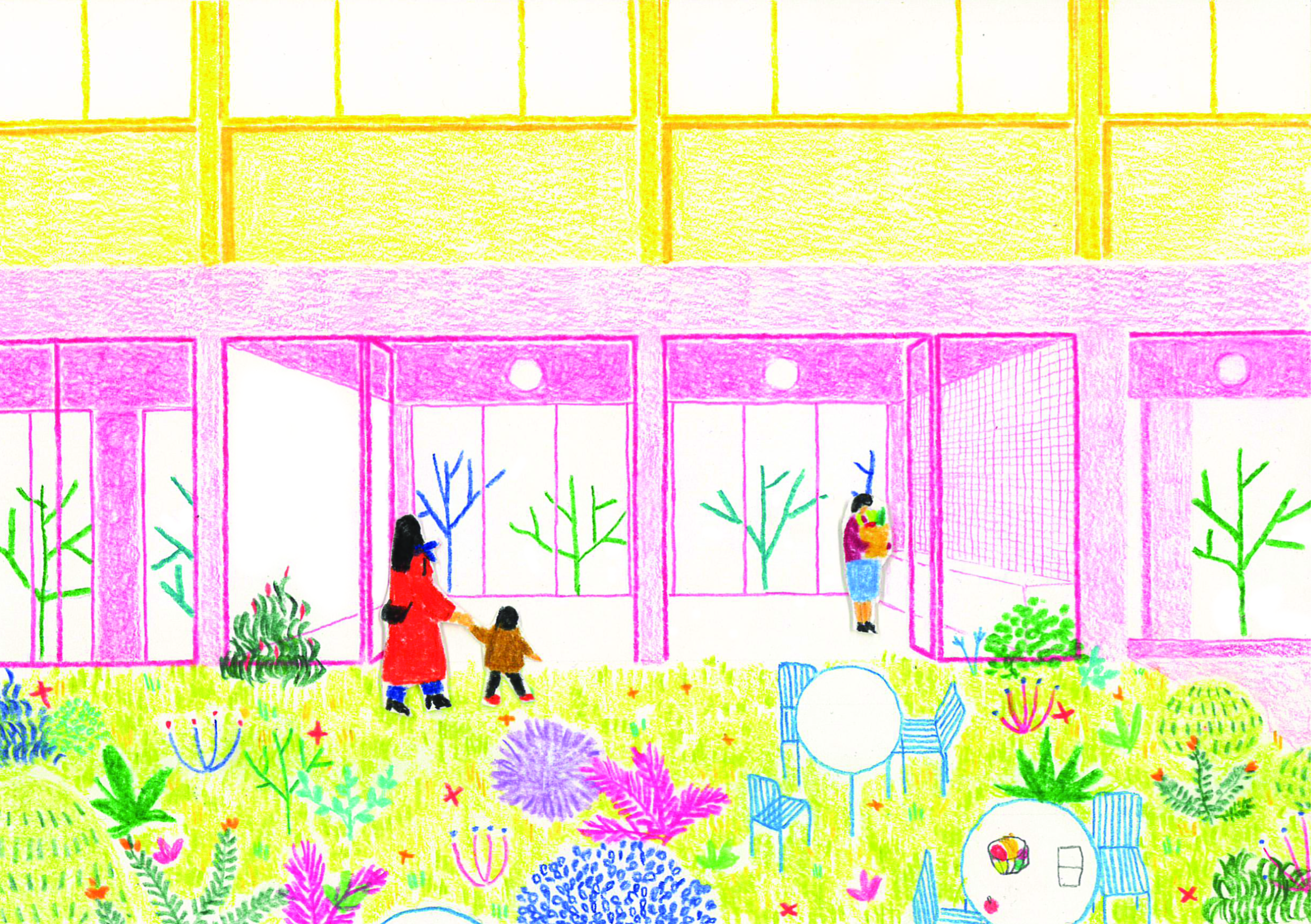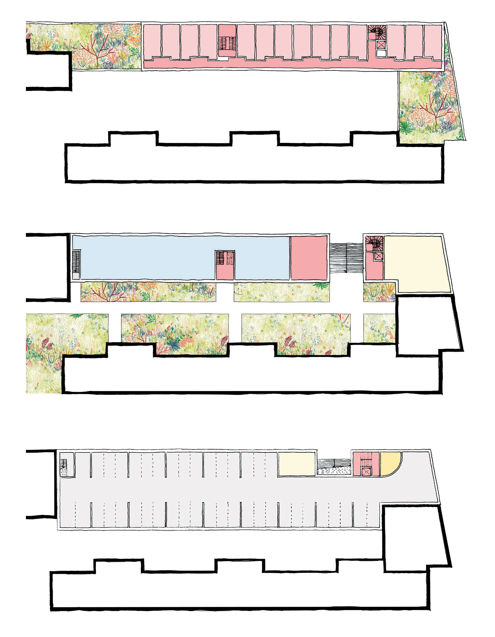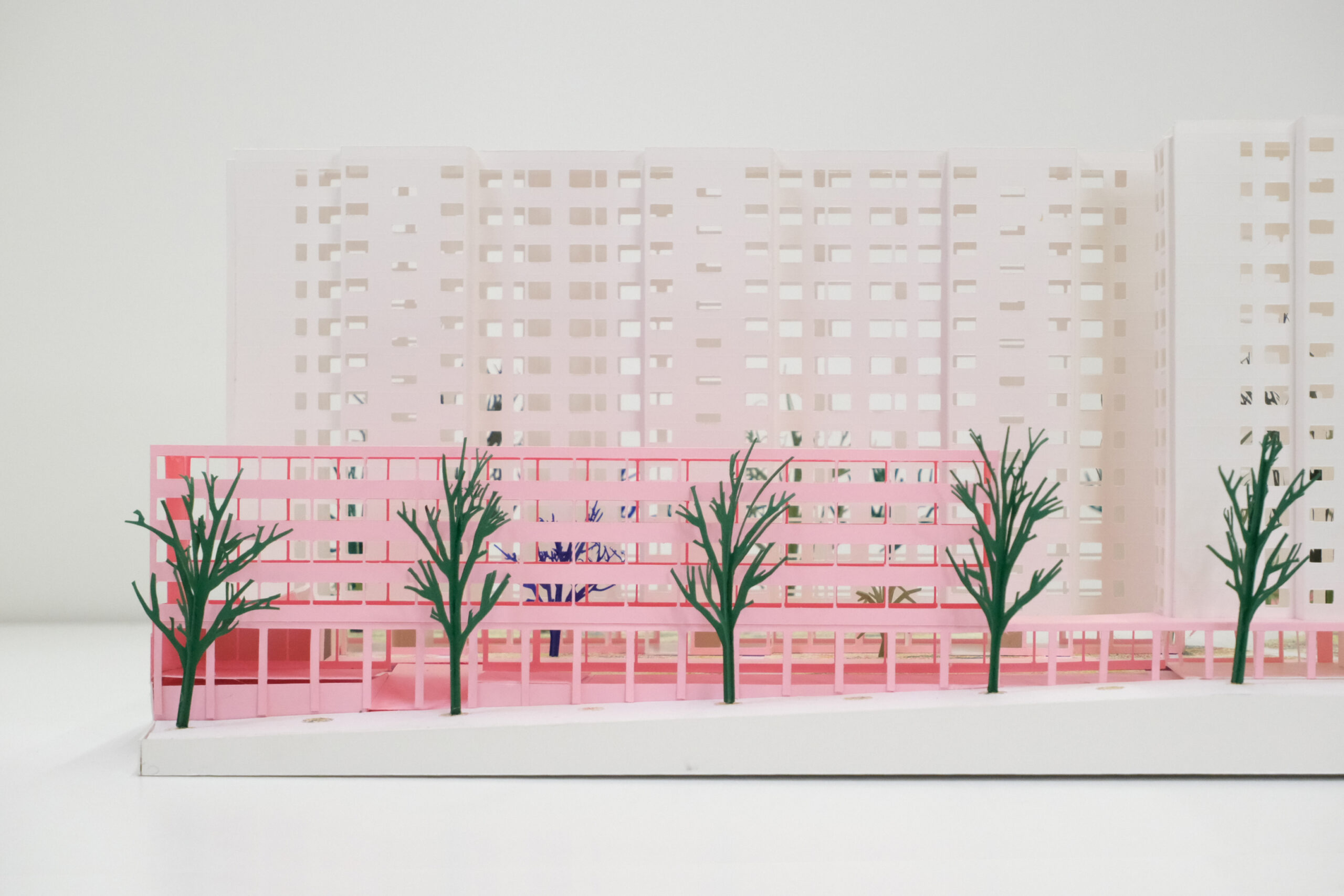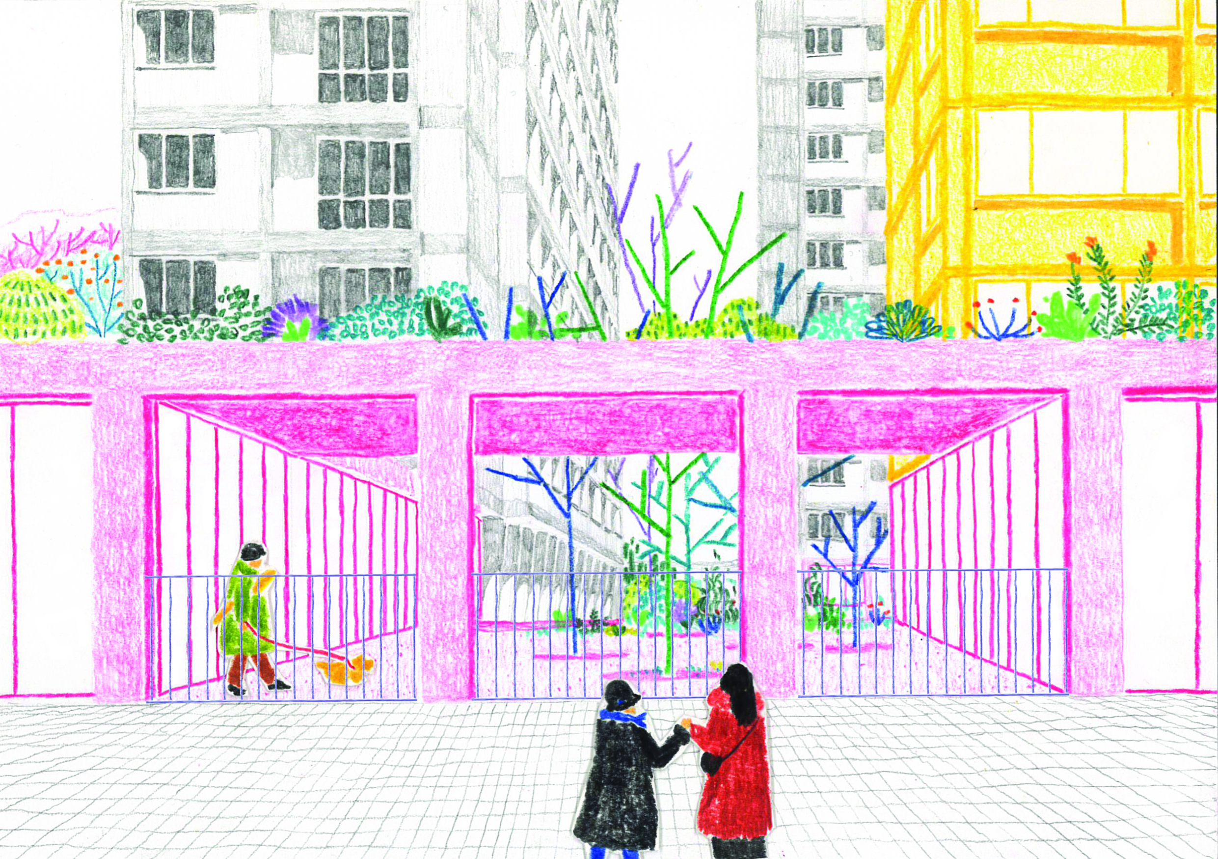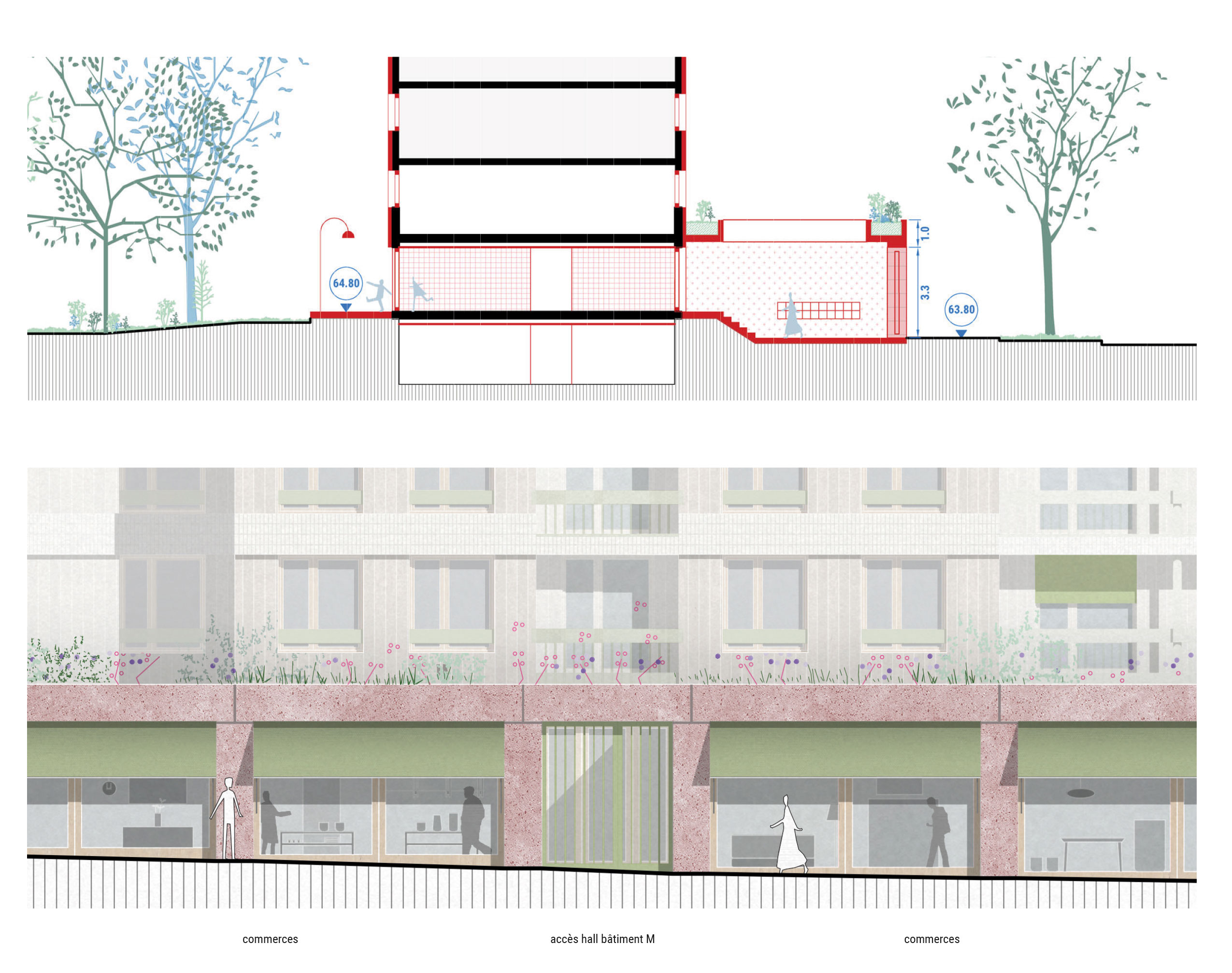 Le projet s’appuie sur une requalification profonde des socles comme interface active entre l’espace public, le cœur d’îlot et les bâtiments, faisant de cette strate le véritable moteur urbain et social de l’opération. Les rez-de-chaussée deviennent des lieux traversants, habités par des commerces, une maison de santé, des halls généreux, des locaux communs et des porches qui assurent une continuité fluide entre le boulevard et le jardin. Les socles unifient l’ensemble des bâtiments existants et neufs par une écriture architecturale commune faite de béton teinté, de menuiseries bois et de grandes vitrines, affirmant une échelle urbaine lisible, vivante et accueillante. Cette strate bâtie se prolonge directement dans le paysage, où le jardin devient la pièce centrale du projet, organisant les usages, les parcours et les sociabilités. Les socles et le jardin forment ainsi un système indissociable, à la fois seuil, socle d’activités, espace public intérieur et paysage domestique, qui transforme en profondeur l’image, les usages et l’identité du site.